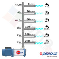 Questa elettropompa serve a spingere l’acqua nell’impianto idrico. La pompa FCRm200/3 è stata ideata e realizzata dall’italiana azienda Pedrollo, ed è utilizzata per il pompaggio di acqua pulita. Rappresenta una delle soluzioni migliori per risolvere il problema di bassa pressione di acqua nel vostro impianto. É un’elettropompa di superficie della famiglia multigiranti centrifughe, con la caratteristica di essere molto silenziosa ed il corpo e molti componenti interni sono in acciaio INOX. Grazie alla sua estrema affidabilità e silenziosità viene utilizzata per molteplici installazioni. Impiegata per uso domestico, utile quindi per aumentare notevolmente la pressione della vostra abitazione, casa, locale ed altre applicazioni simili. In più è ideale anche per uso civile, e quindi grazie alla sua potenza può. Ma nulla toglie che sia ottima per il giardinaggio e quindi perfetta per irrigazione di orti, giardini, serre, prati ed utilizzi appartenenti alla stessa categoria.Il funzionamento della pompa nell’aumentare la pressione del fluido, avviene tramite il sistema multigirante. Questo garantisce rumore molto basso e grazie alle giranti interne ed al loro movimento, nel corpo pompa, avviene l’aumento dell’acqua che viene aspirata dalla bocca di entrata. Una volta aumentata la pressione dell’acqua viene erogata tramite la bocca d’uscita con pressione aumentata.L’elettropompa autoclave si alimenta con tensione monofase, riesce ad erogare un potenza in cavalli di 1,5 hp garantendo una prevalenza fino a 43.5 metri.Il corpo pompa, coperchio, giranti, diffusori e albero motori sono tutti realizzati in acciaio INOX AISI 304, materiale particolarmente indicato per il corretto ed affidabile utilizzato dell’elettropompa, garantendo ottimo funzionamento e lunga durata nel tempo. L’installazione va effettuata in luoghi chiusi ben arieggiati o comunque protetti dalle intemperie in quanto la sua protezione certificata è di tipo IPX5.Per ulteriori informazioni tecniche consultare la scheda tecnica della pompa.