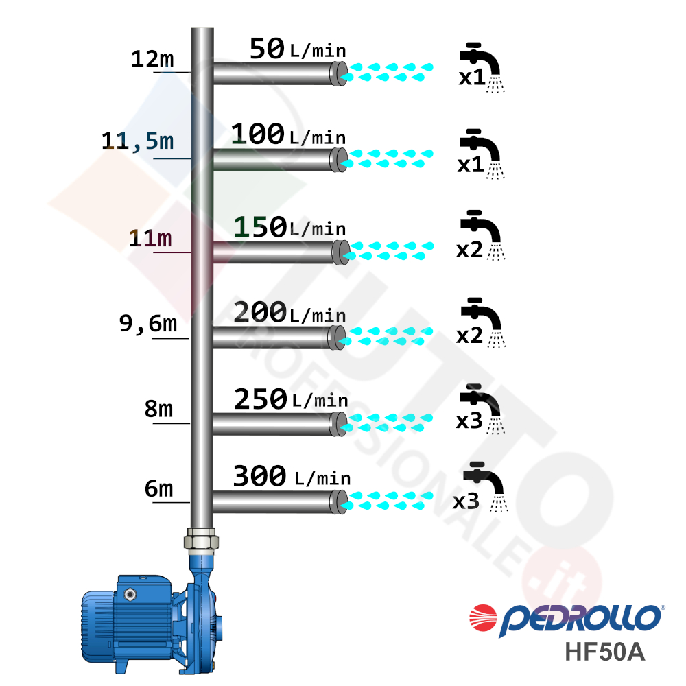 Questa elettropompa serve a spingere l’acqua nell’impianto idrico. La pompa Pedrollo HF 50A è realizzata dalla rinomata azienda Italiana Pedrollo. La pompa di superficie centrifuga viene utilizzata in ambiente civile ed agricolo. Grazie alla sua estrema affidabilità e silenziosità trova un vasto impiego per uso domestico, utile quindi per avere un ottimo aumento pressione dell’acqua nel vostro impianto idrico di casa o altra abitazione simile. La pompa è perfetta per i più svariati utilizzi industriali e quindi predisposta per essere sottoposta a continuo utilizzo, utilizzandola ad esempio per irrigazioni a scorrimento pioggia, per prelievo d’acqua da laghi, fiumi, pozzi o altri utilizzi simili. Nulla toglie però che può avere un ottimo impiego per il giardinaggio e quindi per irrigazione di orti, giardini, serre, prati ed altre applicazioni simili. Un’ elettropompa centrifuga è composta da una parte mobile detta girante, essa girando aspira l’acqua dal tubo di aspirazione e trasferisce all’acqua stessa l’energia generata dal suo movimento. Nel corpo pompa, dove si muove l’acqua spinta dalla forza generata dalla girante, avviene l’aumento della pressione dell’acqua e viene espulsa con pressione elevata dalla bocca di uscita.Questa pompa autoclave si alimenta con una tensione trifase, ha una potenza in cavalli di 0,75 hp la temperatura del liquido da pompare va da -10 °C fino a +90 °C e la temperatura ambiente supportata arriva fino a +40 °C. Il corpo elettropompa è realizzato in ghisa, coperchio e albero motore è realizzato in acciaio inox, girante è realizzata in ottone. Tutti materiali particolarmente indicati per il corretto ed affidabile utilizzato dell’elettropompa, garantendo ottimo funzionamento e lunga durata nel tempo. L’installazione va effettuata in luoghi chiusi ben arieggiati o comunque protetti dalle intemperie in quanto la sua protezione certificata è di tipo IPX4.Per ulteriori informazioni tecniche consultare la scheda tecnica della pompa.