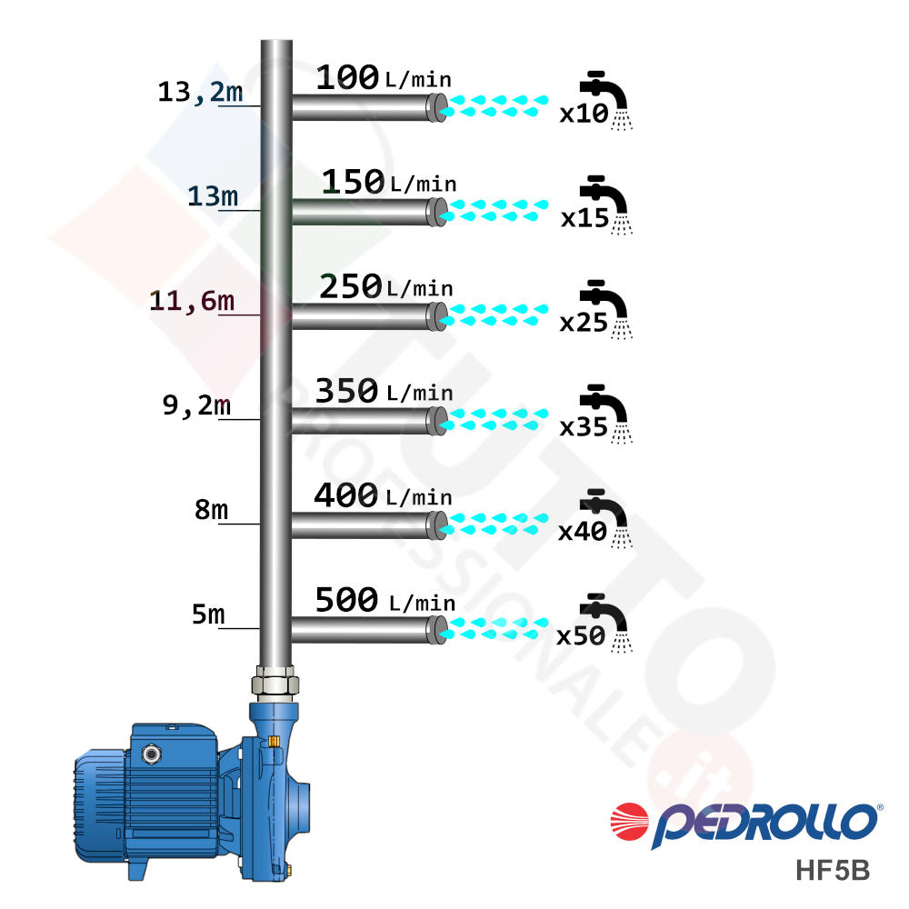 Questa elettropompa serve a spingere l’acqua nell’impianto idrico. La pompa Pedrollo HF5B è realizzata dalla rinomata azienda Italiana Pedrollo. La pompa di superficie centrifuga viene utilizzata in ambiente civile ed agricolo. Grazie alla sua estrema affidabilità e silenziosità trova un vasto impiego per uso domestico, utile quindi per avere un ottimo aumento pressione dell’acqua nel vostro impianto idrico di casa o altra abitazione simile. La pompa è perfetta per i più svariati utilizzi industriali e quindi predisposta per essere sottoposta a continuo utilizzo, utilizzandola ad esempio per irrigazioni a scorrimento pioggia, per prelievo d’acqua da laghi, fiumi, pozzi o altri utilizzi simili. Nulla toglie però che può avere un ottimo impiego per il giardinaggio e quindi per irrigazione di orti, giardini, serre, prati ed altre applicazioni simili. Un’ elettropompa centrifuga è composta da una parte mobile detta girante, essa girando aspira l’acqua dal tubo di aspirazione e trasferisce all’acqua stessa l’energia generata dal suo movimento. Nel corpo pompa, dove si muove l’acqua spinta dalla forza generata dalla girante, avviene l’aumento della pressione dell’acqua e viene espulsa con pressione elevata dalla bocca di uscita.