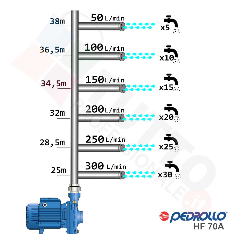 Questa elettropompa serve a spingere l’acqua nell’impianto idrico. La pompa Pedrollo HF 70A è realizzata dalla rinomata azienda Italiana Pedrollo.  La pompa di superficie centrifuga viene utilizzata in ambiente civile ed agricolo. Grazie alla sua estrema affidabilità e silenziosità trova un vasto impiego per uso domestico, utile quindi per avere un ottimo aumento pressione dell’acqua nel vostro impianto idrico di casa o altra abitazione simile. La pompa è perfetta per i più svariati utilizzi industriali e quindi predisposta per essere sottoposta a continuo utilizzo, utilizzandola ad esempio per irrigazioni a scorrimento pioggia, per prelievo d’acqua da laghi, fiumi, pozzi o altri utilizzi simili. Nulla toglie però che può avere un ottimo impiego per il giardinaggio e quindi per irrigazione di orti, giardini, serre, prati ed altre applicazioni simili. Un’ elettropompa centrifuga è composta da una parte mobile detta girante, essa girando aspira l’acqua dal tubo di aspirazione e trasferisce all’acqua stessa l’energia generata dal suo movimento. Nel corpo pompa, dove si muove l’acqua spinta dalla forza generata dalla girante, avviene l’aumento della pressione dell’acqua e viene espulsa con pressione elevata dalla bocca di uscita.Questa pompa autoclave si alimenta con una tensione trifase, ha una potenza in cavalli di 3,00 hp la temperatura del liquido da pompare va da -10 °C fino a +90 °C e la temperatura ambiente supportata arriva fino a +40 °C. Il corpo elettropompa è realizzato in ghisa, coperchio e albero motore è realizzato in acciaio inox, girante è realizzata in ottone. Tutti materiali particolarmente indicati per il corretto ed affidabile utilizzato dell’elettropompa, garantendo ottimo funzionamento e lunga durata nel tempo. L’installazione va effettuata in luoghi chiusi ben arieggiati o comunque protetti dalle intemperie in quanto la sua protezione certificata è di tipo IPX4.Per ulteriori informazioni tecniche consultare la scheda tecnica della pompa.