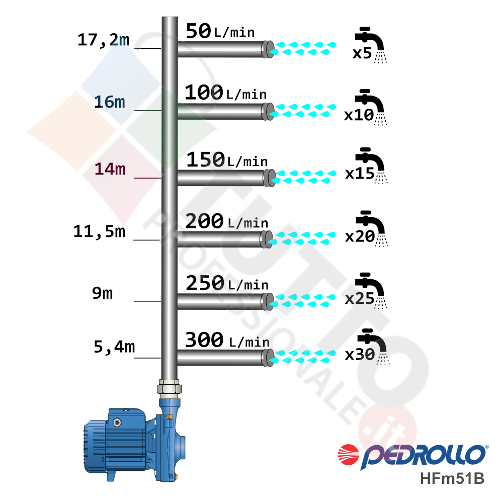 Questa elettropompa serve a spingere l’acqua nell’impianto idrico. La pompa Pedrollo HFm 51B è realizzata dalla rinomata azienda Italiana Pedrollo. La pompa di superficie centrifuga viene utilizzata in ambiente civile ed agricolo. Grazie alla sua estrema affidabilità e silenziosità trova un vasto impiego per uso domestico, utile quindi per avere un ottimo aumento pressione dell’acqua nel vostro impianto idrico di casa o altra abitazione simile. La pompa è perfetta per i più svariati utilizzi industriali e quindi predisposta per essere sottoposta a continuo utilizzo, utilizzandola ad esempio per irrigazioni a scorrimento pioggia, per prelievo d’acqua da laghi, fiumi, pozzi o altri utilizzi simili. Nulla toglie però che può avere un ottimo impiego per il giardinaggio e quindi per irrigazione di orti, giardini, serre, prati ed altre applicazioni simili. Questa elettropompa aumenta la pressione dell’acqua grazie alla tecnologia “centrifuga”. Ê composta da una parte mobile detta girante, essa girando aspira l’acqua dal tubo di aspirazione e trasferisce all’acqua stessa l’energia generata dal suo movimento. Nel corpo pompa, dove si muove l’acqua spinta dalla forza generata dalla girante, avviene l’aumento della pressione dell’acqua e viene espulsa con pressione elevata dalla bocca di uscita. Questa pompa autoclave si alimenta con una tensione monofase, ha una potenza in cavalli di 0,75 hp la temperatura del liquido da pompare va da -10 °C fino a +90 °C e la temperatura ambiente supportata arriva fino a +40 °C. Il corpo elettropompa è realizzato in ghisa, coperchio e albero motore è realizzato in acciaio inox, girante è realizzata in ottone. Tutti materiali particolarmente indicati per il corretto ed affidabile utilizzato dell’elettropompa, garantendo ottimo funzionamento e lunga durata nel tempo. L’installazione va effettuata in luoghi chiusi ben arieggiati o comunque protetti dalle intemperie in quanto la sua protezione certificata è di tipo IPX4.Per ulteriori informazioni tecniche consultare la scheda tecnica della pompa.