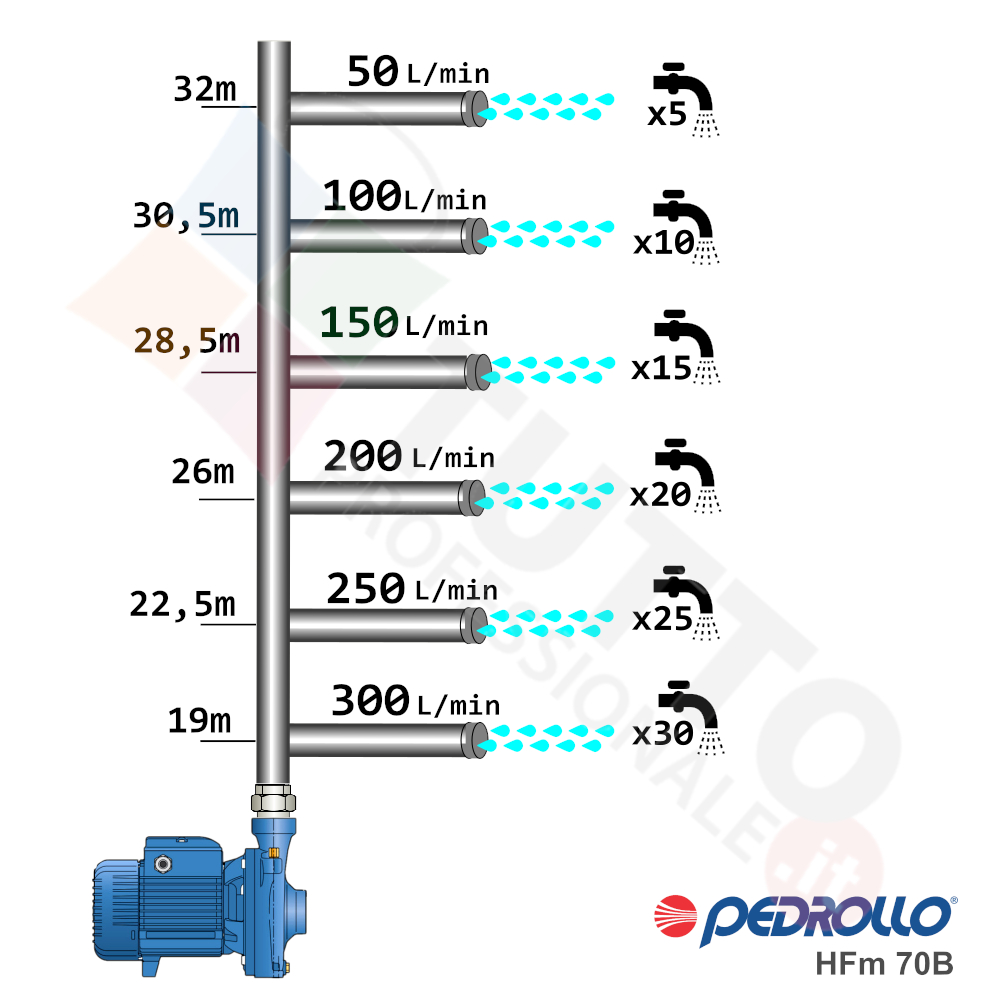 Questa elettropompa serve a spingere l’acqua nell’impianto idrico. La pompa Pedrollo HFm 70B è realizzata dalla rinomata azienda Italiana Pedrollo. La pompa di superficie centrifuga viene utilizzata in ambiente civile ed agricolo. Grazie alla sua estrema affidabilità e silenziosità trova un vasto impiego per uso domestico, utile quindi per avere un ottimo aumento pressione dell’acqua nel vostro impianto idrico di casa o altra abitazione simile. La pompa è perfetta per i più svariati utilizzi industriali e quindi predisposta per essere sottoposta a continuo utilizzo, utilizzandola ad esempio per irrigazioni a scorrimento pioggia, per prelievo d’acqua da laghi, fiumi, pozzi o altri utilizzi simili. Nulla toglie però che può avere un ottimo impiego per il giardinaggio e quindi per irrigazione di orti, giardini, serre, prati ed altre applicazioni simili. Questa elettropompa aumenta la pressione dell’acqua grazie alla tecnologia “centrifuga”. Ê composta da una parte mobile detta girante, essa girando aspira l’acqua dal tubo di aspirazione e trasferisce all’acqua stessa l’energia generata dal suo movimento. Nel corpo pompa, dove si muove l’acqua spinta dalla forza generata dalla girante, avviene l’aumento della pressione dell’acqua e viene espulsa con pressione elevata dalla bocca di uscita.Questa pompa autoclave si alimenta con una tensione monofase, ha una potenza in cavalli di 2 hp la temperatura del liquido da pompare va da -10 °C fino a +90 °C e la temperatura ambiente supportata arriva fino a +40 °C. Il corpo elettropompa è realizzato in ghisa, coperchio e albero motore è realizzato in acciaio inox, girante è realizzata in ottone. Tutti materiali particolarmente indicati per il corretto ed affidabile utilizzato dell’elettropompa, garantendo ottimo funzionamento e lunga durata nel tempo. L’installazione va effettuata in luoghi chiusi ben arieggiati o comunque protetti dalle intemperie in quanto la sua protezione certificata è di tipo IPX4.Per ulteriori informazioni tecniche consultare la scheda tecnica della pompa.