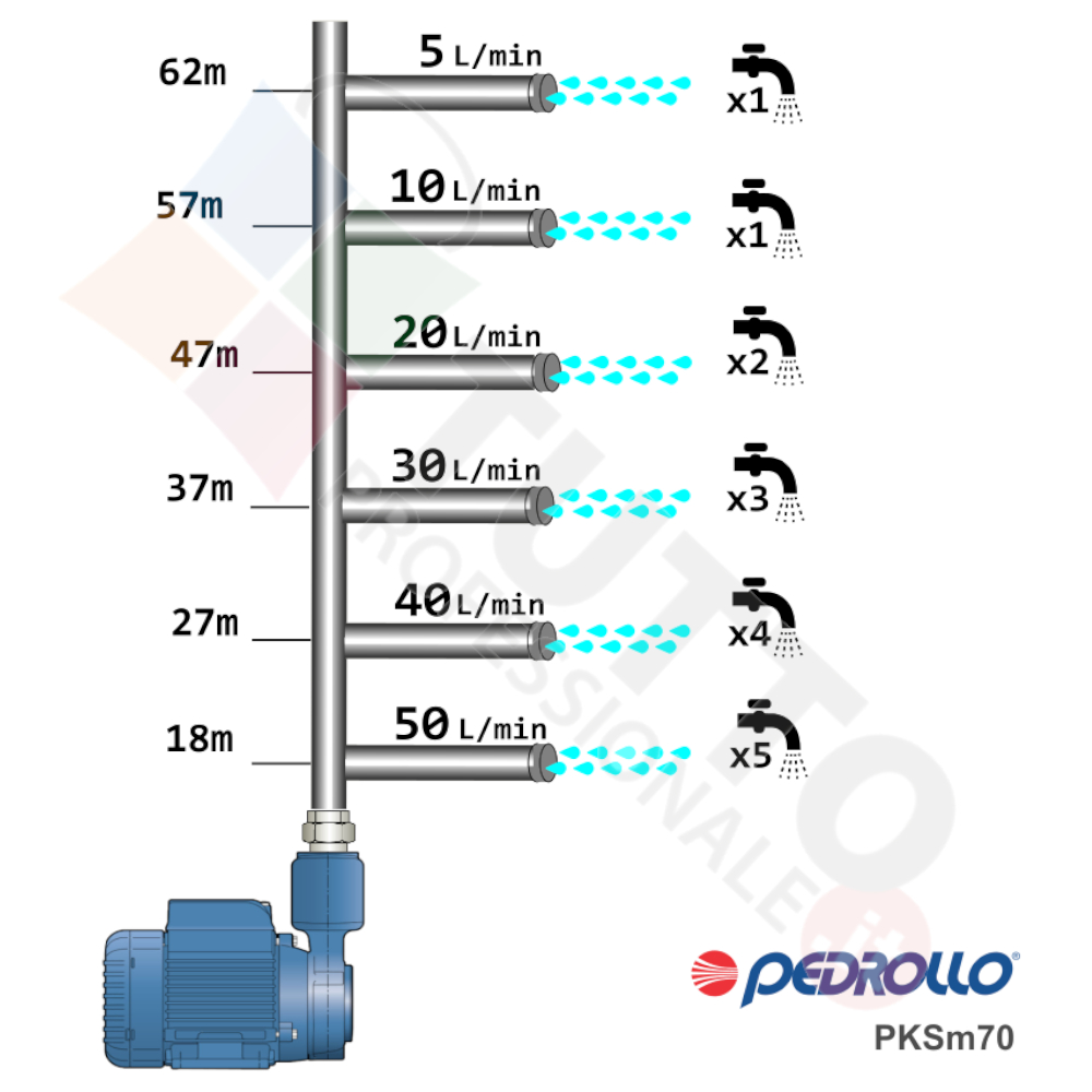 Questa elettropompa serve a spingere l’acqua nell’impianto idrico. La pompa PKSm 70, realizzata dalla rinomata azienda italiana Pedrollo, è una elettropompa di superficie appartenente alla famiglia delle pompe periferiche autoadescanti. Questa pompa autoadescante periferica viene utilizzata per il pompaggio di acque pulite all’interno di impianti domestici o piccoli impianti di irrigazione. La pompa autoadescante ha la particolarità di aspirare l’aria contenuta nel tubo di aspirazione, questo accade grazie al movimento rotatorio della girante che crea una forte turbolenza nel liquido contenuto all’interno del corpo pompa, e genera a sua volta una depressione risucchiando l’aria in essa contenuta. Subito dopo il misto aria-liquido viene subito spinto nella camera d’innescamento della pompa, dove l’aria si separa ed esce dal tubo di mandata ed il liquido ricade e torna in circolazione.Questa elettropompa periferica risulta molto utile per aumentare la pressione della vostra casa o altra abitazione in modo ottimale e costante, accoppiandola ad esempio ad alcuni presscontrol, piccoli serbatoi autoclavi o altri sistemi per il controllo della pressione da erogare. Risulta indicata anche per il giardinaggio e quindi per irrigazione di orti, giardini, serre, prati ed altre applicazioni simili.Parlando della pompa periferica in questione evidenziamo subito che va alimentata con una tensione monofase, ha una potenza in cavalli di 0,85 hp e la temperatura del liquido da pompare va da da -10 °C fino a +90 °C.Il corpo pompa è realizzato in ghisa ed internamente possiede una girante in ottone e albero motore in acciaio inox, quindi tutti materiali particolarmente indicati per il corretto ed affidabile utilizzato dell’elettropompa, garantendo ottima resa e lunga durata nel tempo. L’installazione va effettuata in luoghi chiusi ben arieggiati o comunque protetti dalle intemperie in quanto la sua protezione certificata è di tipo IPX5.Per ulteriori informazioni tecniche consultare la scheda tecnica della pompa.