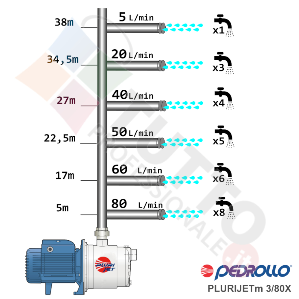 Questa elettropompa serve a spingere l’acqua nell’impianto idrico. La pompa PLURIJETm3/80X, realizzata dalla rinomata azienda italiana Pedrollo, è un’elettropompa di superficie multigirante autoadescante con corpo pompa INOX. La pompa in questione grazie alla sua estrema affidabilità e silenziosità trova un vasto impiego per uso domestico, utile quindi per aumentare la pressione dell’acqua della vostra casa o altra abitazione e risulta indicata anche per il giardinaggio e quindi per irrigazione di orti, giardini, serre, prati ed altre applicazioni simili. La pompa è ideale quindi per aumentare la pressione in modo ottimale e costante, accoppiandola ad esempio ad alcuni presscontrol, piccoli serbatoi autoclavi o altri sistemi per il controllo della pressione da erogare.La pompa autoadescante ha la particolarità di aspirare l’aria contenuta nel tubo di aspirazione, questo accade grazie al movimento rotatorio della giranti che creano una forte turbolenza nel liquido contenuto all’interno del corpo pompa, e genera a sua volta una depressione risucchiando l’aria in essa contenuta. Essendo una pompa multigirante il rumore generato è molto basso, al suo interno troviamo più parti mobili dette appunto giranti, esse girando aspirando l’acqua dal tubo di aspirazione e trasferiscono all’acqua stessa l’energia generata dal loro movimento. Nel corpo pompa, dove si muove l’acqua spinta dalla forza generata dalle giranti, avviene l’aumento della pressione dell’acqua e viene espulsa con pressione elevata dalla bocca di uscita.La pompa autoclave si alimenta con una tensione monofase, ha una potenza in cavalli di 0,65 hp, la temperatura del liquido da pompare va da -10 °C fino a +40 °C, temperatura ambiente fino a +40 °C.Il corpo pompa, coperchio, e albero motore sono realizzati tutti in ACCIAIO INOX, mentre le giranti sono realizzate in Noryl, Tutti materiali particolarmenti indicati per il corretto ed affidabile utilizzato dell’elettropompa, garantendo ottimo funzionamento e lunga durata nel tempo. L’installazione va effettuata in luoghi chiusi ben arieggiati o comunque protetti dalle intemperie in quanto la sua protezione certificata è di tipo IPX4.Per ulteriori informazioni tecniche consultare la scheda tecnica della pompa.