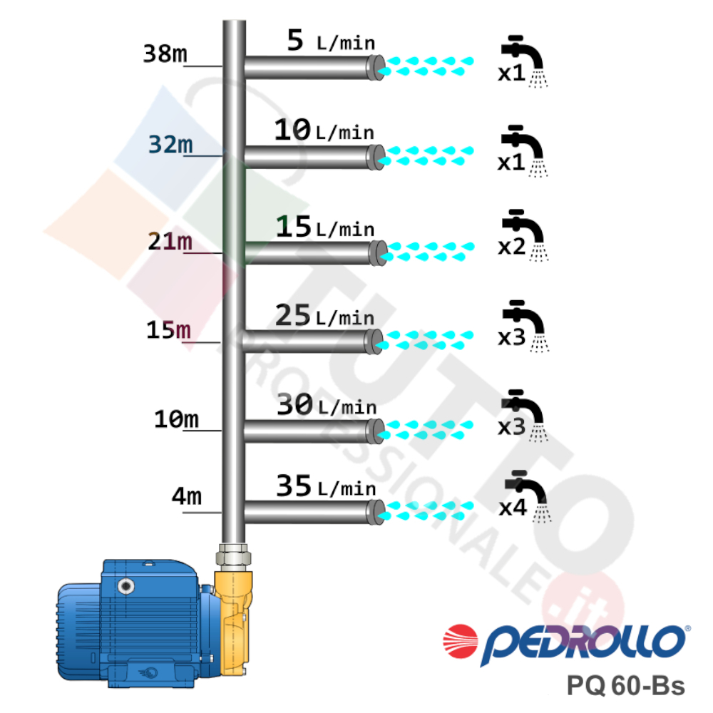 Questa elettropompa serve a spingere l’acqua nell’impianto idrico. Questa pompa serve per spingere l’acqua nell’impianto idrico. La pompa PQ60-BS, realizzata dalla rinomata azienda italiana Pedrollo, è una elettropompa di superficie appartenente alla famiglia delle pompe periferiche. Viene utilizzata per il pompaggio di acque pulite. Grazie alla sua estrema affidabilità trova un vasto impiego per uso industriali e quindi predisposta per essere sottoposta a continuo utilizzo, utilizzandola ad esempio per irrigazioni a scorrimento pioggia, per prelievo d’acqua da laghi, fiumi, pozzi o altri utilizzi simili. Il funzionamento della pompa periferica è molto semplice ed affidabile, in quanto per mezzo del movimento della girante nel corpo pompante si aumenta la pressione dell’acqua pompata ed espulsa tramite la bocca d’uscita. La pompa va accoppiata a presscontrol, piccoli serbatoi autoclavi o altri sistemi per il controllo della pressione da erogare.