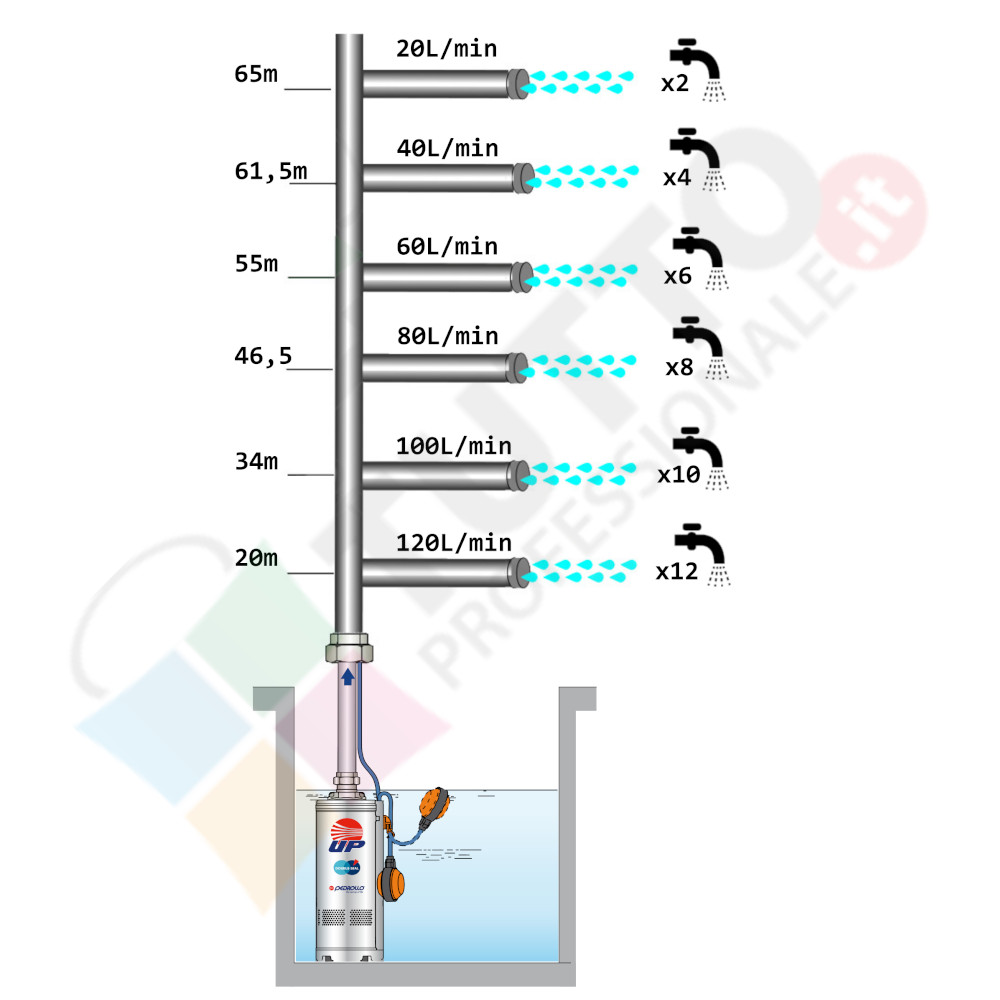 Questa elettropompa serve a spingere l’acqua nell’impianto idrico. L’elettropompa UP, realizzata dalla rinomata azienda italiana Pedrollo, fa parte della famiglia sommersa multigirante. La pompa sommersa va immersa nell’acqua in verticale o in orizzontale e grazie ai fori laterali la pompa andrà a pescare l’acqua per poi farla uscire dalla bocca d’uscita con pressione notevolmente aumentata. Possiede un pratico galleggiante che controlla il livello del liquido minimo richiesto per far partire l’elettropompa, evitando marce a secco e prolungando la vita della pompa stessa. Queste pompe elettriche grazie al loro elevato rendimento e affidabilità trovano un vasto impiego per uso domestico, ad esempio immerse in serbatoi, pozzi, pozzetti o impieghi simili per poi spingere l’acqua con ottima pressione nell’impianto di casa, ville, condomini, uffici e altre situazioni simili. È ottima per l’utilizzo agricolo per irrigazione di orti, serre, giardini e altri impieghi simili. La pompa andrà poi associata ad un presscontrol o sistema autoclave per controllare la pressione erogata in base alle vostre esigienze.