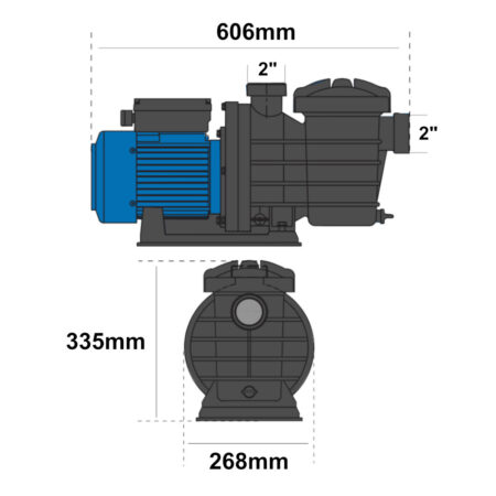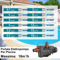 La potenza in cavalli della pompa è di 0,80hp e quindi garantisce un ricircolo dell’acqua alla portata di 18 metri cubi all’ora. L’alimentazione della pompa è di tipo Monofase e quindi lavora con voltaggio di 230-240V a 50Hz. Garantisce un alto rendimento con servizio continuo e l’acqua su cui andrà a lavorare l’elettropompa non dovrà superare i 35°C. I materiali della pompa per piscina sono tutti di prima scelta, partendo dal corpo pompa tecnopolimero e la girante in Noryl.