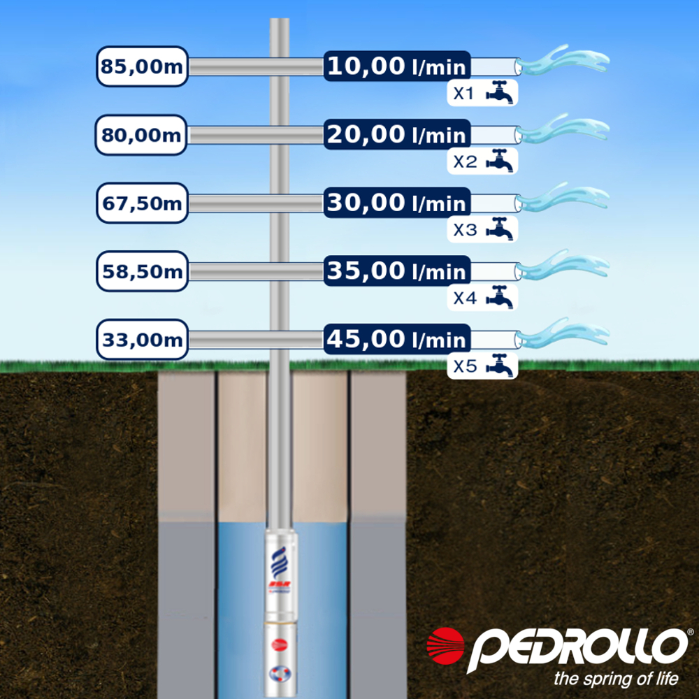 Questa elettropompa serve a spingere l’acqua nell’impianto idrico. Le nuove pompe sommerse 3SR2 sono realizzate dalla rinomata azienda Pedrollo e rispetto ai modelli precedenti, raggiungono prestazioni e rendimenti maggiori grazie all’utilizzo di nuove componentistiche come la girante completamente flottante.Vengono utilizzate per diverse applicazioni, quali approvvigionamento domestico, irritazione ed impianti idrici e possono essere installate sia in verticale che in orizzontale.Uno dei suoi tanti vantaggi oltre alle sue alte prestazioni è il suo diametro di soli 3″, che permette di risparmiare sui costi di eventuale trivellazione di nuovo pozzo, ed in caso di perforazione preesistente, la pompa 3SR è la soluzione sostitutiva ideale, soprattutto in presenza di pozzi vecchi e incrostati.Una sua nuova particolarità come già accennato precedentemente è la girante utilizzata che gode della tecnologia flottante, permettendo il pompaggio di acqua con contenuto di sabbia fino a 150 g/m 3.La girante è agganciata al motore riavvolgibile grazie all’attacco NEMA, una flangia di collegamento universale utilizzato oltre che con Pedrollo, anche con giranti e motori di altre aziende! quindi eventuale cambio di girante o motore risulterà semplice grazie all’universalità del tipo di attacco.L’elettropompa 4931221PLA1 sommergibile ha una tensione monofase a 230V, una potenza in cavalli di 0.75hp ed assorbimento di 0.50kw. Garantisce una portata massima di 45l/min ad un’altezza di 33 metri, ed una portata minima di 10l/min ad un’altezza di 85 metri.L’isolamento garantito è di classe F, quindi il motore nel suo punto massimo di lavoro può arrivare fino a 155° C – gradi centigradi.Il grado di protezione IP68 rende il motore adatto ad un’immersione permanente in acqua e garantisce protezione totale contro l’ingresso di polveri ed altro.Il prodotto viene fornito con apposito cavo di alimentazione con lunghezza di 1,5 metri.