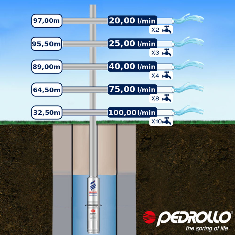 L’elettropompa sommergibile ha la valvola di ritegno integrata, una tensione monofase a 230V, una potenza in cavalli di 1,50hp ed assorbimento di 1,00kw. Garantisce una portata massima di 100l/min ad un’altezza di 32.5 metri, ed una portata minima di 20l/min ad un’altezza di 97 metri.