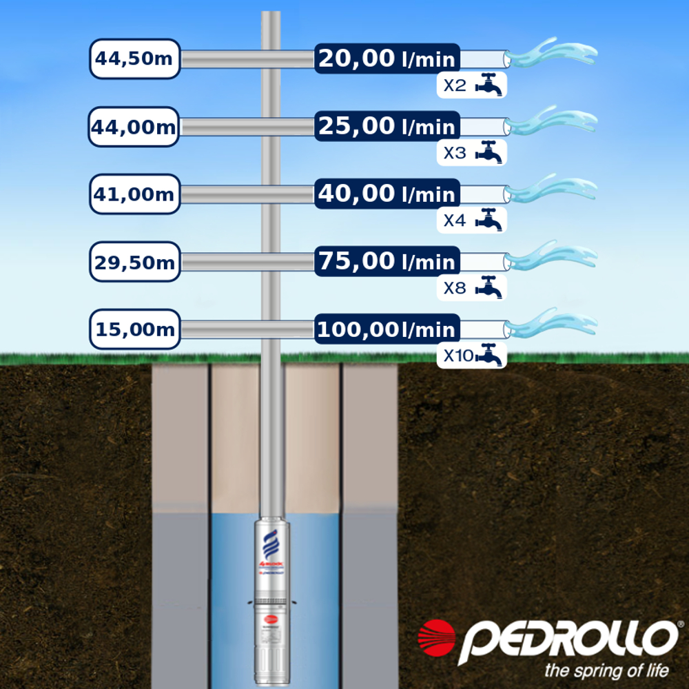 Il modello 49M42406LA1 rappresenta uno della nuova serie, prodotti che raggiungono prestazioni e rendimenti maggiori rispetto ai precedenti grazie all’utilizzo di nuove componentistiche come la girante completamente flottante, permettendo il pompaggio di acqua con contenuto di sabbia fino a 200 g/m 3 ed un aumento del rendimenti al vertice per questo tipo di elettropompe (+12% rispetto alla serie precedente) con consumo di energia nettamente ridotto.