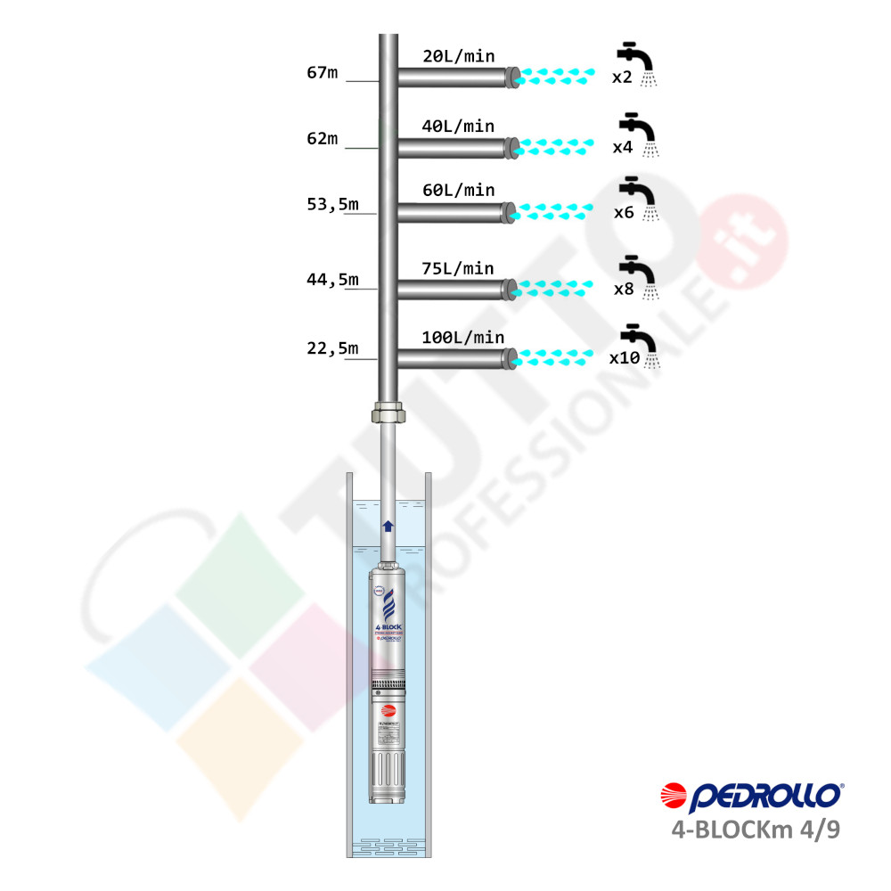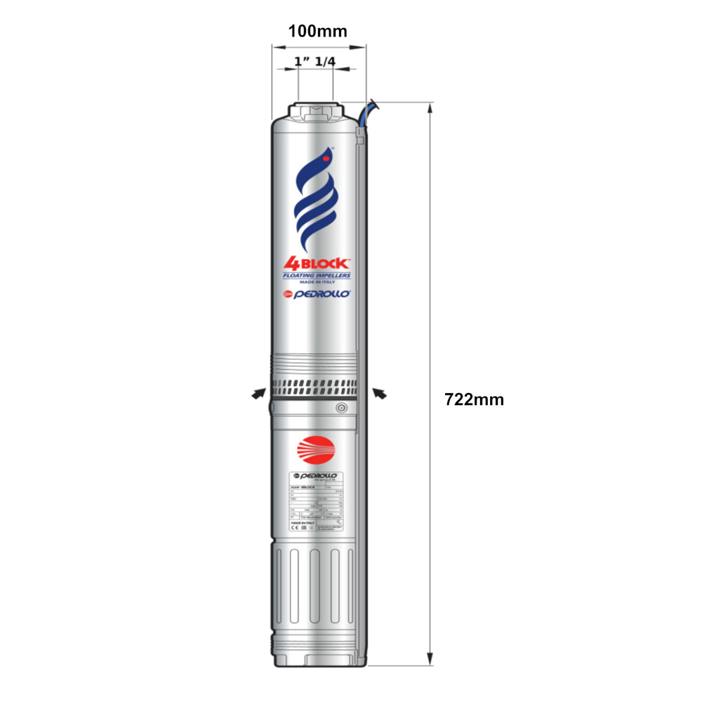 Questa elettropompa serve a spingere l’acqua nell’impianto idrico. La serie 4BLOCK sono ideate e realizzate dall’azienda PEDROLLO in ITALIA, parliamo di elettropompe sommerse monoblocco in acciaio inox già pronte all’installazione in quanto sono giù incluse di condensatore, salvamotore termico incorporato nel motore e cavo di alimentazione da 20m.