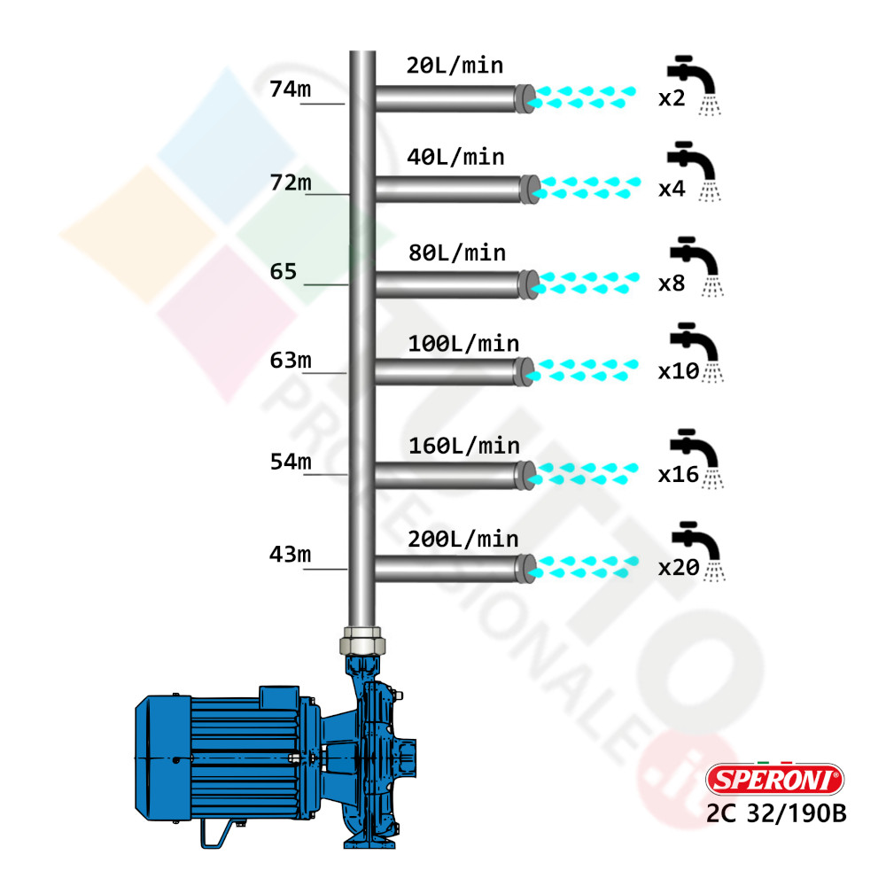 Questa elettropompa serve a spingere l’acqua nell’impianto idrico. La pompa 2C 32/190B realizzata dalla rinomata azienda Speroni, è una elettropompa di superficie appartenente alla famiglia delle pompe centrifughe. Viene utilizzata in molteplici applicazioni per il pompaggio di acque pulite. Il suo utilizzo può essere di tipo domestico, civile e agricolo. Una pompa centrifuga doppia girante è composta da due parti mobili dette giranti, esse girando aspirano l’acqua dal tubo di aspirazione e trasferiscono all’acqua stessa l’energia generata dal loro movimento. In aggiunta una caratteristica principale di questa elettropompa è l’impiego di due giranti contrapposte, le quali a differenza dei modelli monogiranti, sono in grado di garantire elevate prevalenze.