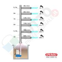 Questa elettropompa serve per il drenaggio di acque. La pompa SNG 1000 realizzata dalla rinomata azienda Speroni, è una elettropompa ideata e pensata per essere utilizzata in ambito domestico per effettuare drenaggio di liquidi con corpi solidi fino ad un diametro di 50mm. É in grado di pompare acque pulite ed anche acque sporche. Il suo funzionamento è semplice ed automatico, in quanto possiede un galleggiante, il quale si occupa dell’accensione e dello spegnimento della pompa. Parlando della pompa sommergibile in questione evidenziamo subito che va alimentata con una tensione monofase tramite l’apposito cavo da 10 metri H07RNF, ha una potenza in cavalli di 1,00 hp e la temperatura del liquido da pompare massima è di +35 °C. Per di più è in grado di aspirare ad un’altezza di minimo 70mm e può essere immersa fino a 10 metri. Per quanto riguarda materiali all’interno notiamo che cassa motore, girante, griglia di aspirazione, albero motore e girante sono realizzati in acciaio inox AISI 304, mentre il corpo pompa è costruito in ghisa. L’accurata scelta dei materiali uniti all’esperienza di Speroni, portano la pompa SXG 1000-VS ad essere una soluzione duratura e soprattutto affidabile per il drenaggio di acque luride ed acque pulite. Inoltre l’installazione può essere effettuata tranquillamente anche immergendo totalmente la pompa nel liquido, in quanto la sua protezione certificata è IP68. Per ulteriori informazioni tecniche sulla pompa sommersa drenante consultare la scheda tecnica della pompa.