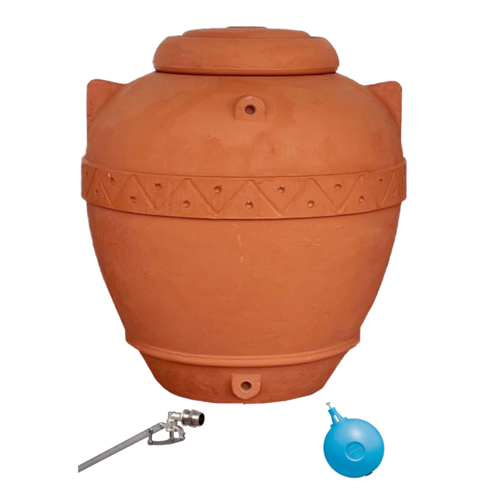 La cisterna ha una capacità totale di 500 litri, si presenta con un colore terracotta ed ha una forma ad anfora.